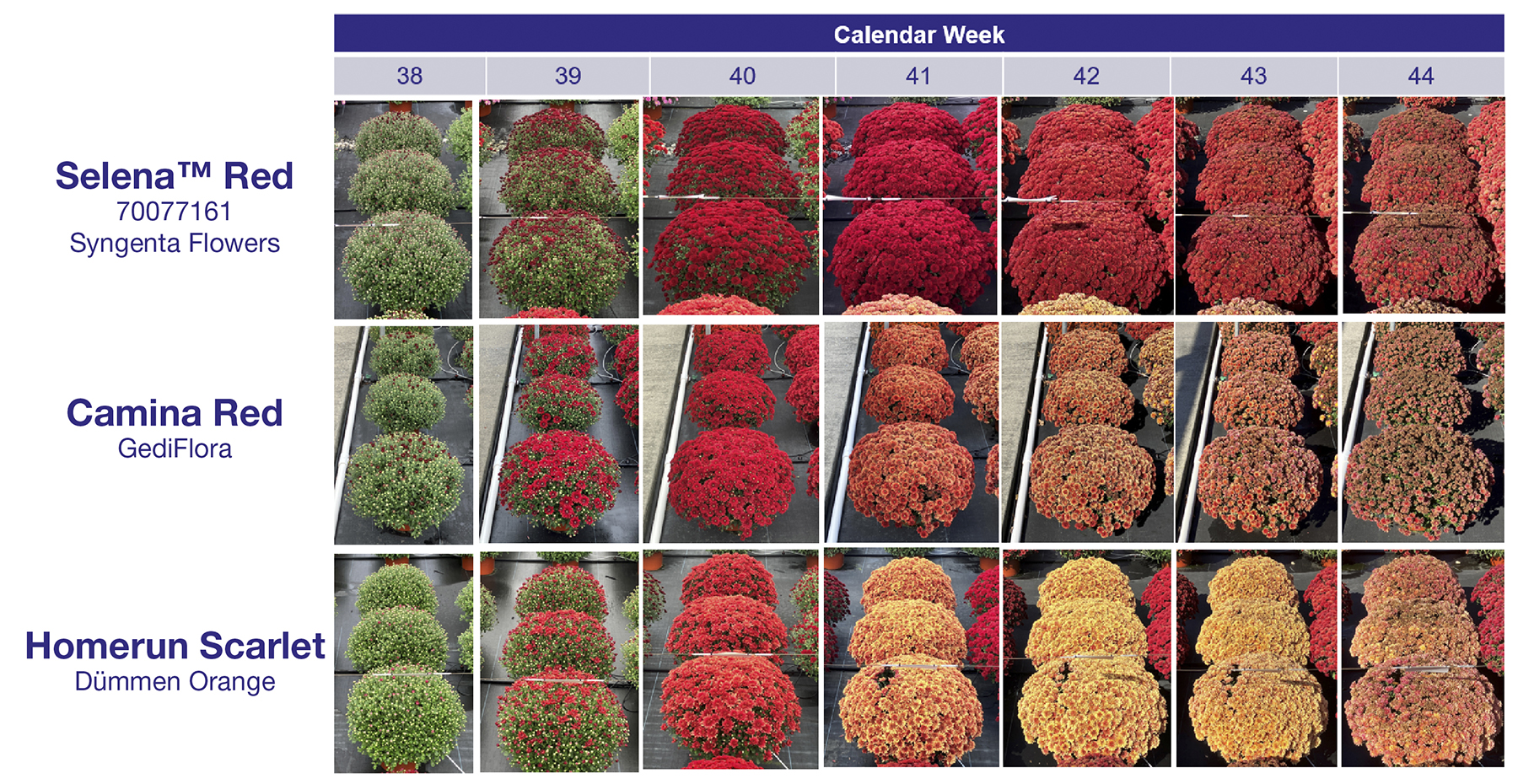 As breeders figure out the genetics behind a red with long life, they've spread that capability into other series as well. This trend helps growers build long-lasting red mum programs over the full season.