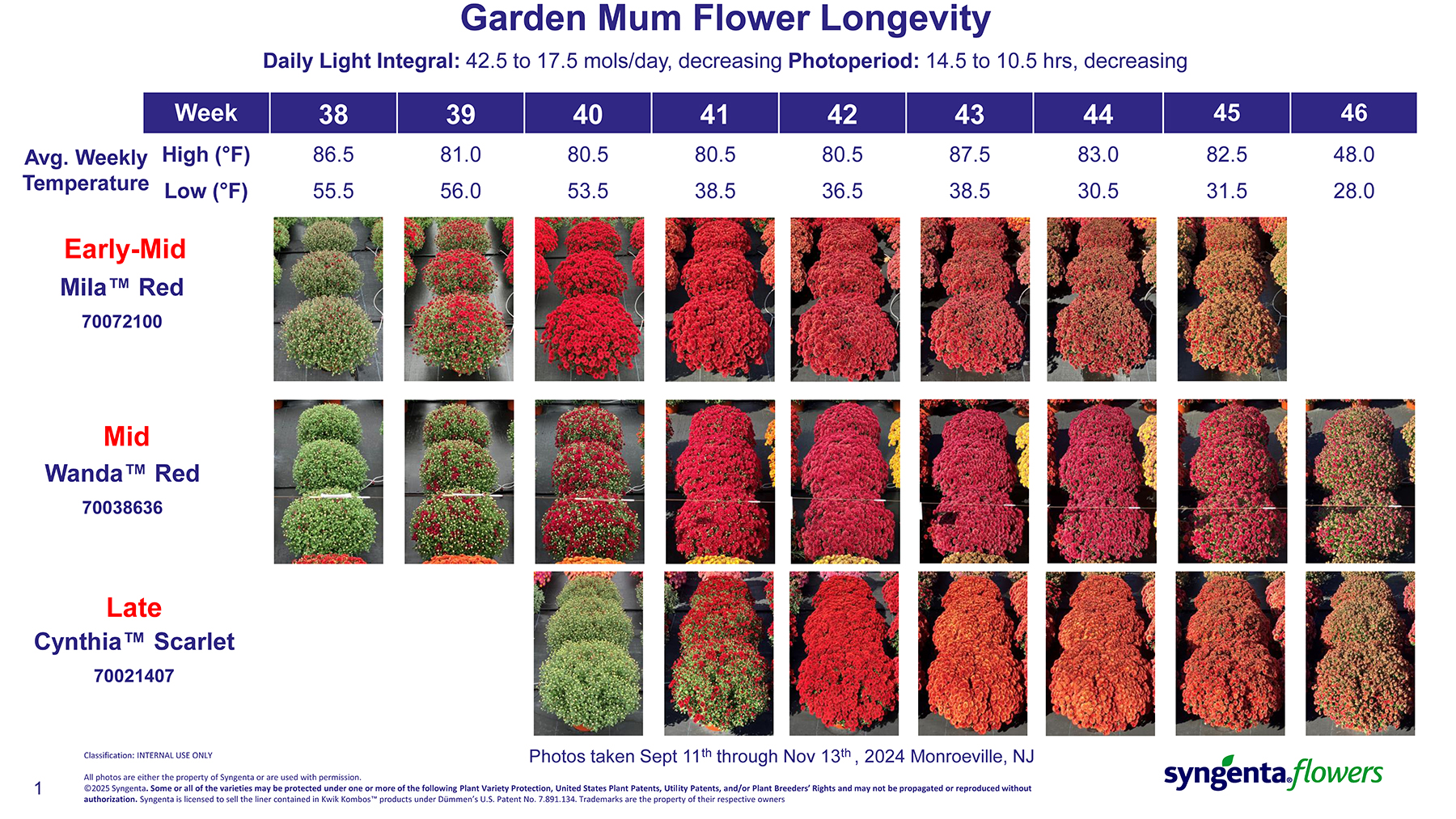 Photography from the mum trials at Lucas Greenhouses last year captures an important moment for the industry. Amidst the core colors, red is notorious for fading early. Among some older varieties still sold today, red transitions from cracking color to retail prime to curling brown by the third week. Vibrancy typically wanes quickly, followed by a dull red or orange and a general degrade of the product.